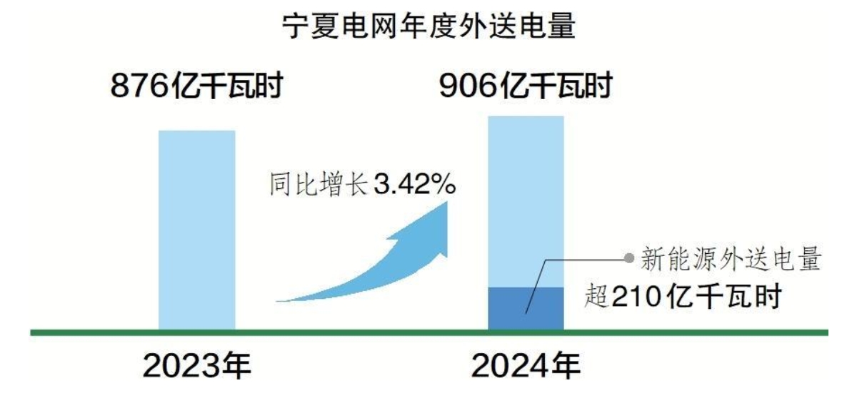中國儲能網(wǎng)訊:日前從寧夏電力交易中心有限公司獲悉,寧夏電網(wǎng)2024年外送電量達(dá)906億千瓦時,同比增長3.42%,繼2022年之后外送電量再次突破900億千瓦時,超額完成全年外送電量目標(biāo)。寧夏電網(wǎng)2024年新能源外送電量超210億千瓦時,同比增長53.28%,創(chuàng)歷史新高。