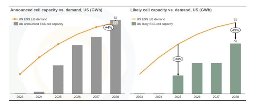 對(duì)于美國(guó)儲(chǔ)能行業(yè)而言,其可能被認(rèn)為依賴于廉價(jià)進(jìn)口的磷酸鐵鋰(LFP)電池。然而,首個(gè)針對(duì)電池儲(chǔ)能產(chǎn)品的關(guān)稅是拜登政府于2024年5月宣布的,即從2026年開(kāi)始對(duì)中國(guó)制造的電池征收25%關(guān)稅。此舉與先進(jìn)的制造業(yè)稅收抵免以及對(duì)美國(guó)國(guó)內(nèi)制造產(chǎn)品投資的稅收抵免措施相結(jié)合,旨在加速美國(guó)電池制造業(yè)發(fā)展。這一舉措已經(jīng)初見(jiàn)成效,據(jù)清潔能源協(xié)會(huì)(CEA)統(tǒng)計(jì),目前美國(guó)宣布的用于儲(chǔ)能系統(tǒng)的電池產(chǎn)能已超過(guò)80GWh,預(yù)計(jì)將在2028年前實(shí)現(xiàn)這一目標(biāo)。