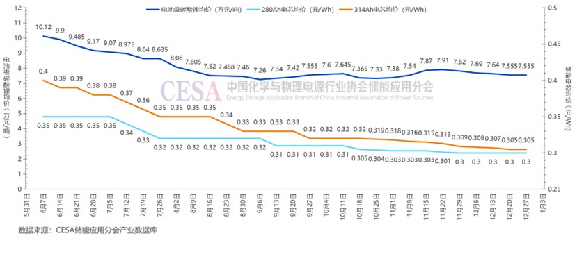 上游原材料價(jià)格的大幅度下跌,為鋰電池降本提供了一定空間,也推動(dòng)了鋰電池價(jià)格的下降。受原材料價(jià)格下行和供需關(guān)系的雙重影響,截至2024年12月底,314Ah和280Ah磷酸鐵鋰電芯價(jià)格都基本維持在0.3元/Wh左右,部分314Ah 電芯廠商出現(xiàn)0.27元/Wh成交價(jià)。