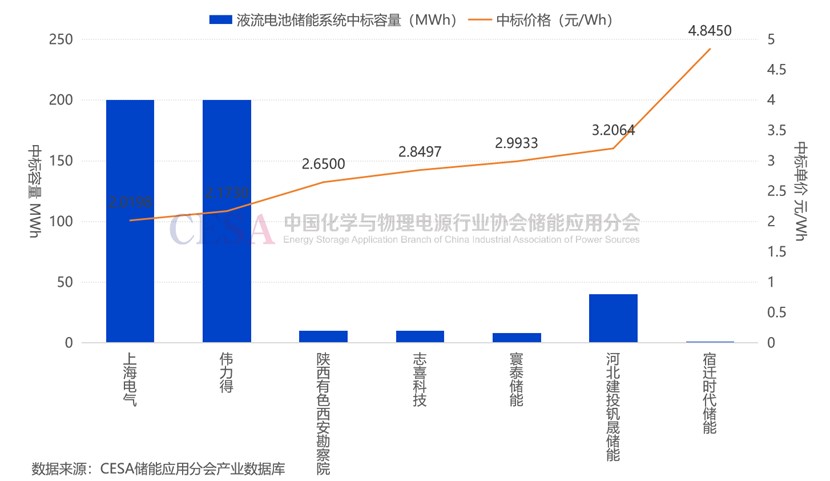圖7 2024年部分企業(yè)液流電池儲(chǔ)能系統(tǒng)中標(biāo)規(guī)模及對(duì)應(yīng)中標(biāo)價(jià)格