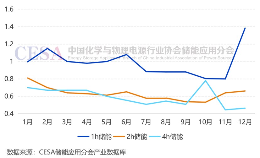 就全年來看,1h磷酸鐵鋰儲(chǔ)能系統(tǒng)中標(biāo)均價(jià)除2月、6月、12月回彈外,其他月份呈平穩(wěn)下滑趨勢(shì)。12月,1h鋰電儲(chǔ)能系統(tǒng)平均價(jià)格為1.383元/Wh,主要為火儲(chǔ)聯(lián)合調(diào)頻項(xiàng)目,樣本較少,報(bào)價(jià)較高。