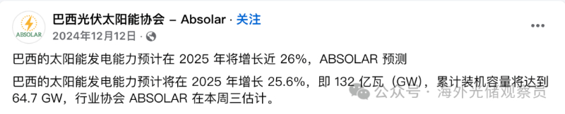 盡管面臨關(guān)稅壓力,但巴西光伏協(xié)會(huì)(ABSOLAR)對(duì)2025年裝機(jī)仍給出樂(lè)觀預(yù)計(jì),該協(xié)會(huì)預(yù)計(jì)巴西在2025年將新增13.2GW光伏裝機(jī)。越來(lái)越頻繁的極端天氣,特別是干旱季節(jié)的延長(zhǎng),迫使依賴(lài)水力發(fā)電的巴西加快能源轉(zhuǎn)型。