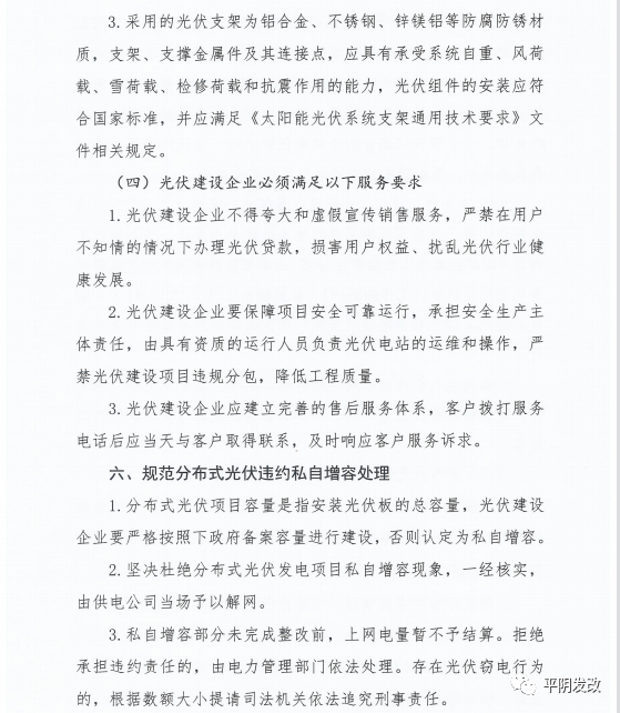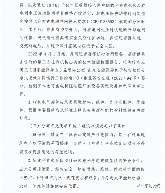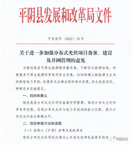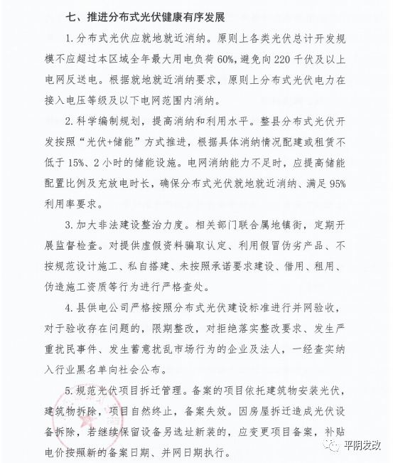 中國儲能網訊:日前,山東省濟南市平陰縣發(fā)改局印發(fā)《關于進一步加強分布式光伏項目備案、建設及并網管理的意見》,文件提出分布式光伏應就地就近消納。原則上各類光伏總計開發(fā)規(guī)模不應超過本區(qū)域全年最大用電負荷60%,避免向220千伏及以上電網反送電。根據(jù)就地就近消納要求,原則上分布式光伏電力在接入電壓等級及以下電網范圍內消納。