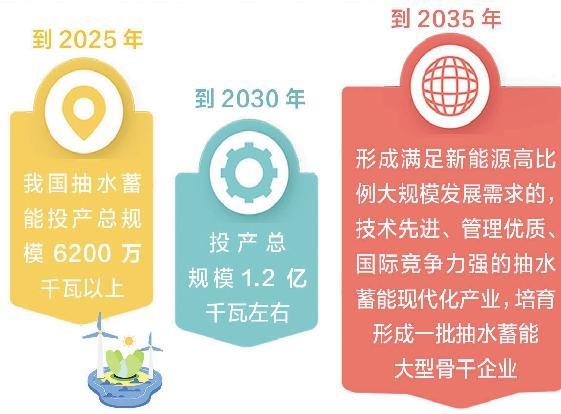 《規(guī)劃》要求加快抽水蓄能電站核準(zhǔn)建設(shè),各省(區(qū)、市)能源主管部門根據(jù)中長(zhǎng)期規(guī)劃,結(jié)合本地區(qū)實(shí)際情況,統(tǒng)籌電力系統(tǒng)需求、新能源發(fā)展等,按照能核盡核、能開盡開的原則,在規(guī)劃重點(diǎn)實(shí)施項(xiàng)目庫(kù)內(nèi)核準(zhǔn)建設(shè)抽水蓄能電站。到2025年,抽水蓄能投產(chǎn)總規(guī)模較“十三五”翻一番,達(dá)到6200萬(wàn)千瓦以上;到2030年,抽水蓄能投產(chǎn)總規(guī)模較“十四五”再翻一番,達(dá)到1.2億千瓦左右;到2035年,形成滿足新能源高比例大規(guī)模發(fā)展需求的,技術(shù)先進(jìn)、管理優(yōu)質(zhì)、國(guó)際競(jìng)爭(zhēng)力強(qiáng)的抽水蓄能現(xiàn)代化產(chǎn)業(yè),培育形成一批抽水蓄能大型骨干企業(yè)。