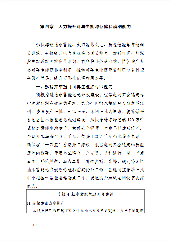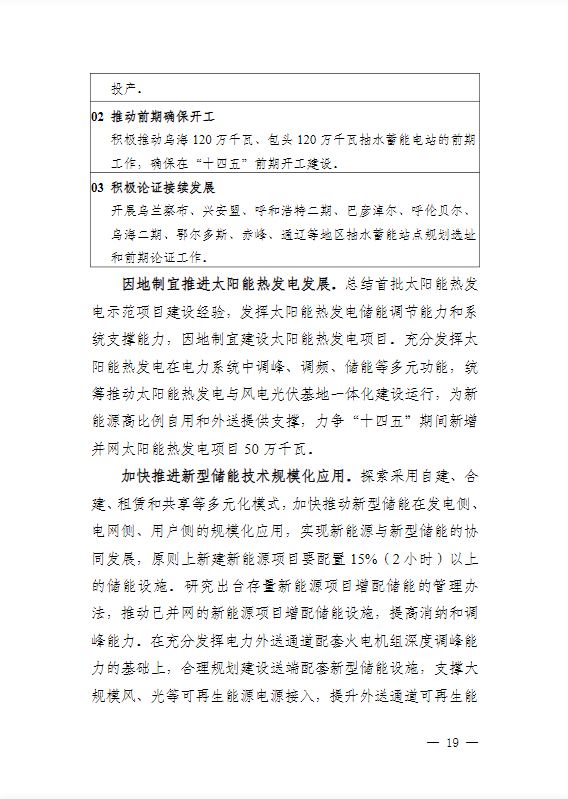 該規(guī)劃指出,積極推進(jìn)抽水蓄能電站開發(fā)建設(shè)。統(tǒng)籌電網(wǎng)安全穩(wěn)定運(yùn)行和新能源高效消納需求,結(jié)合全國抽水蓄能中長期發(fā)展規(guī)劃,按照投產(chǎn)一批、開工一批、謀劃一批的思路,統(tǒng)籌做好自治區(qū)抽水蓄能電站規(guī)劃建設(shè)。加快推進(jìn)赤峰芝瑞 120 萬千瓦抽水蓄能電站建設(shè),做好安全管理,力爭早日建成投產(chǎn)。早日開工烏海120萬千瓦、包頭120萬千瓦抽水蓄能電站, 確保在“十四五”前期開工建設(shè)。根據(jù)電網(wǎng)安全穩(wěn)定和新能源消納需要,開展烏蘭察布、興安盟、呼和浩特二期、巴彥淖爾、呼倫貝爾、烏海二期、鄂爾多斯、赤峰、通遼等地區(qū)抽水蓄能站點(diǎn)規(guī)劃選址和前期論證工作。因地制宜推動(dòng)一批中小型抽水蓄能電站選點(diǎn)工作,就地提升局域電網(wǎng)調(diào)節(jié)支撐能力。