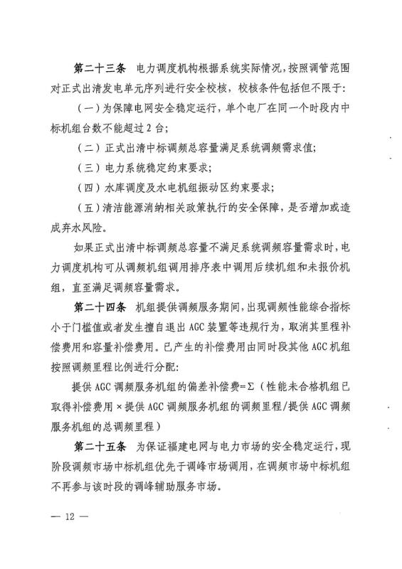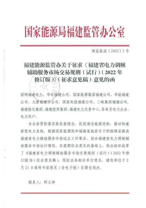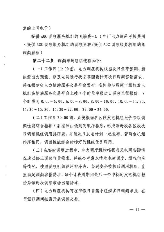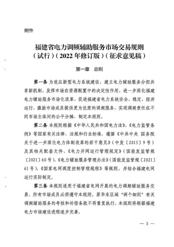 中國(guó)儲(chǔ)能網(wǎng)訊:1月21日,福建能監(jiān)辦發(fā)布關(guān)于征求《福建省電力調(diào)頻輔助服務(wù)市場(chǎng)交易規(guī)則(試行)(2022年修訂版)》(征求意見(jiàn)稿)意見(jiàn)的函,修訂版中綜合調(diào)頻性能指標(biāo)不低于0.55,儲(chǔ)能電站可作為調(diào)頻服務(wù)主體,但要求不小于10MW,快速地區(qū)報(bào)價(jià)上限12元/MW,慢速地區(qū)報(bào)價(jià)上限16元/MW。