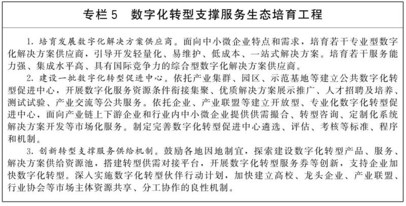 (一)加快企業(yè)數(shù)字化轉(zhuǎn)型升級。引導企業(yè)強化數(shù)字化思維,提升員工數(shù)字技能和數(shù)據(jù)管理能力,全面系統(tǒng)推動企業(yè)研發(fā)設計、生產(chǎn)加工、經(jīng)營管理、銷售服務等業(yè)務數(shù)字化轉(zhuǎn)型。支持有條件的大型企業(yè)打造一體化數(shù)字平臺,全面整合企業(yè)內(nèi)部信息系統(tǒng),強化全流程數(shù)據(jù)貫通,加快全價值鏈業(yè)務協(xié)同,形成數(shù)據(jù)驅(qū)動的智能決策能力,提升企業(yè)整體運行效率和產(chǎn)業(yè)鏈上下游協(xié)同效率。實施中小企業(yè)數(shù)字化賦能專項行動,支持中小企業(yè)從數(shù)字化轉(zhuǎn)型需求迫切的環(huán)節(jié)入手,加快推進線上營銷、遠程協(xié)作、數(shù)字化辦公、智能生產(chǎn)線等應用,由點及面向全業(yè)務全流程數(shù)字化轉(zhuǎn)型延伸拓展。鼓勵和支持互聯(lián)網(wǎng)平臺、行業(yè)龍頭企業(yè)等立足自身優(yōu)勢,開放數(shù)字化資源和能力,幫助傳統(tǒng)企業(yè)和中小企業(yè)實現(xiàn)數(shù)字化轉(zhuǎn)型。推行普惠性“上云用數(shù)賦智”服務,推動企業(yè)上云、上平臺,降低技術(shù)和資金壁壘,加快企業(yè)數(shù)字化轉(zhuǎn)型。