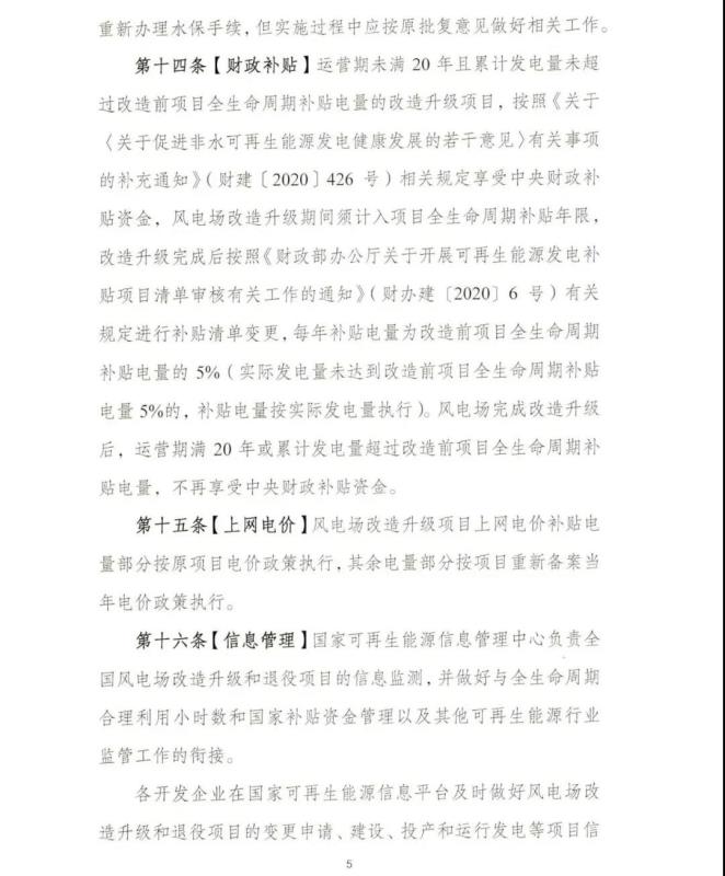 財政補(bǔ)貼方面,運(yùn)營期未滿20年且累計(jì)發(fā)電量未超過改造前項(xiàng)目全生命周期補(bǔ)貼電量的改造升級項(xiàng)目,按照《關(guān)于〈關(guān)于促進(jìn)非水可再生能源發(fā)電健康發(fā)展的若干意見〉有關(guān)事項(xiàng)的補(bǔ)充通知》(財建〔2020〕426號)相關(guān)規(guī)定享受中央財政補(bǔ)貼資金,風(fēng)電場改造升級期間須計(jì)入項(xiàng)目全生命周期補(bǔ)貼年限,改造升級完成后按照《財政部辦公廳關(guān)于開展可再生能源發(fā)電補(bǔ)貼項(xiàng)目清單審核有關(guān)工作的通知》(財辦建〔2020〕6號)有關(guān)規(guī)定進(jìn)行補(bǔ)貼清單變更,每年補(bǔ)貼電量為改造前項(xiàng)目全生命周期補(bǔ)貼電量的5%(實(shí)際發(fā)電量未達(dá)到改造前項(xiàng)目全生命周期補(bǔ)貼電量5%的,補(bǔ)貼電量按實(shí)際發(fā)電量執(zhí)行)。風(fēng)電場完成改造升級后,運(yùn)營期滿20年或累計(jì)發(fā)電量超過改造前項(xiàng)目全生命周期補(bǔ)貼電量,不再享受中央財政補(bǔ)貼資金。