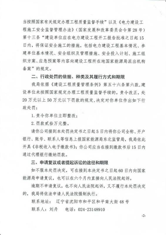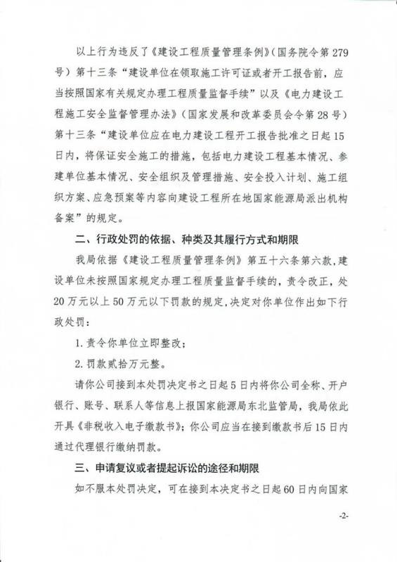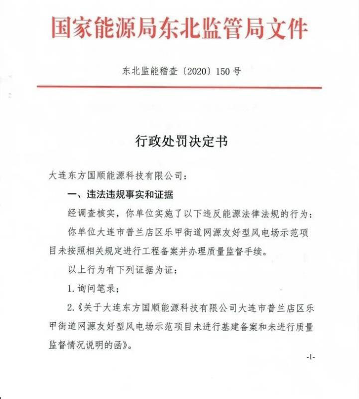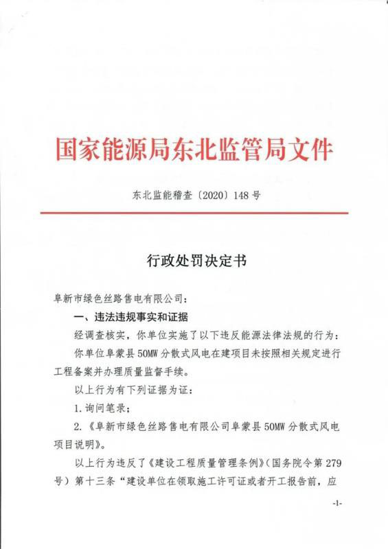 中國儲能網(wǎng)訊:近期國家能源局東北監(jiān)管局相繼發(fā)布四條行政處罰決定書,涉及4家能源企業(yè)的5個風(fēng)電項(xiàng)目,分別為:大連東方國順能源科技有限公司,大連市普蘭店區(qū)樂甲街道網(wǎng)源友好型風(fēng)電場示范項(xiàng)目;阜新市綠色絲路售電有限公司,阜蒙縣50MW分散式風(fēng)電在建項(xiàng)目;阜新招聯(lián)綠昌風(fēng)力發(fā)電有限公司,阜蒙40MW分散式風(fēng)電在建項(xiàng)目;國電和風(fēng)風(fēng)電開發(fā)有限公司芳山分公司,在建的黑山景家49.5MW風(fēng)電項(xiàng)目&國電黑山水泉49.5MW風(fēng)電項(xiàng)目。