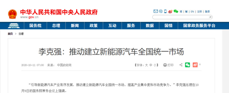 “引導(dǎo)新能源汽車產(chǎn)業(yè)有序發(fā)展,推動(dòng)建立新能源汽車全國統(tǒng)一市場,提高產(chǎn)業(yè)集中度和市場競爭力?!崩羁藦?qiáng)總理在10月9日的國務(wù)院常務(wù)會(huì)議上強(qiáng)調(diào)。