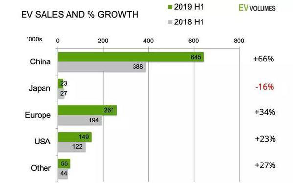 2019年上半年和2018年上半年主要國家和地區(qū)電動(dòng)汽車銷量和增速