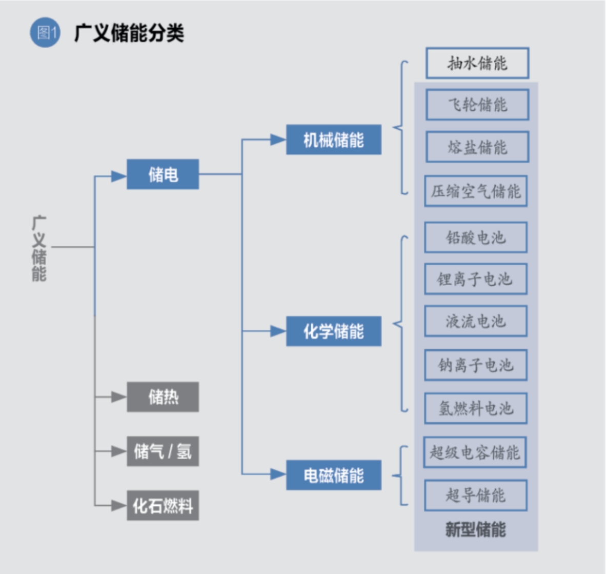 廣義上來看,儲能包括儲電、儲熱、儲氣/氫以及化石燃料,本文核心討論儲電。以電能釋放的儲能方式主要分為機(jī)械儲能、電磁儲能和電化學(xué)儲能三類(見圖1)。