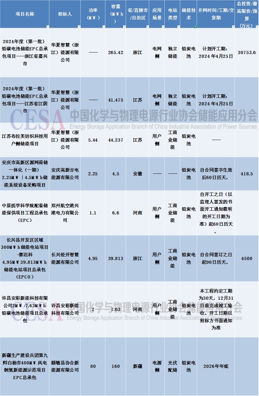 從市場情況來看,據(jù)CESA儲能應用分會不完全統(tǒng)計2024年應用鉛炭電池技術的新型儲能招標項目共計8個,規(guī)模合計95.74MW/569.67MWh,投資總額35672.06萬元。其中最大投資額項目為2024年度(第一批)鉛炭電池儲能EPC總承包項目,具體建設地點位于浙江省嘉興市與江蘇省江陰市,擬新建AGM鉛酸鉛炭電池儲能電站,裝機容量分別為265.421MWh、41.475MWh。項目充分利用所在地區(qū)峰谷電價特點,通過合理規(guī)劃儲能,可節(jié)約電力資源,降低能耗成本,對提升當?shù)仉娋W(wǎng)平衡調(diào)節(jié)和安全保障能力具有重要意義。項目將采用先進的鉛炭電池技術,為相關區(qū)域提供高效、穩(wěn)定的儲能解決方案,助力能源的優(yōu)化配置和利用。計劃開工期為2024 年4月25日。