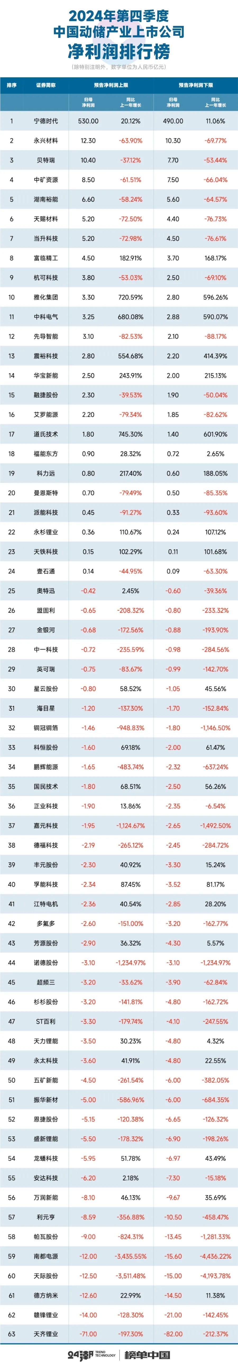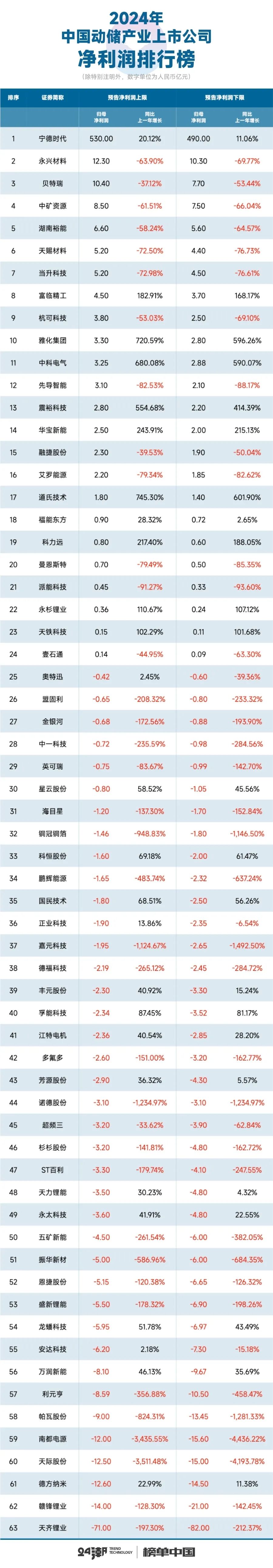 全年,多達(dá)39家動(dòng)儲(chǔ)企業(yè)出現(xiàn)虧損,占比達(dá)62%,虧損企業(yè)數(shù)量比2023年增加了12家。具體到企業(yè)層面,2024年寧德時(shí)代全年盈利490-530億元,盈利能力是第二名到第二十名之和(65.15-80.15億元)的7.52倍-6.61倍,是無可爭(zhēng)議的盈利之王。
