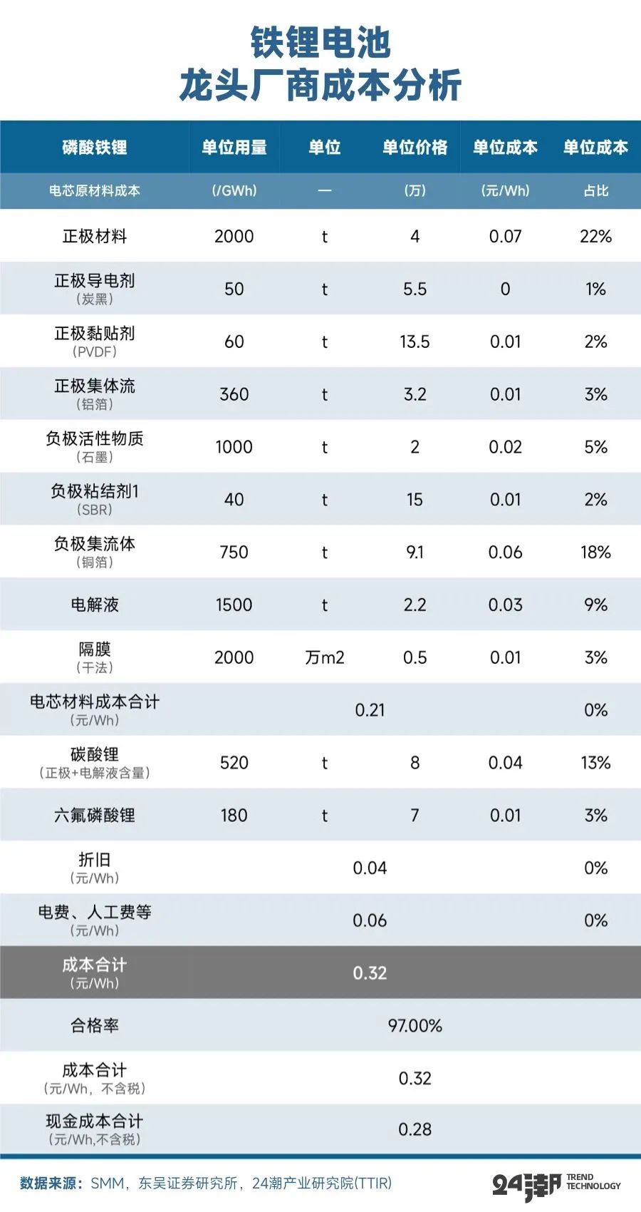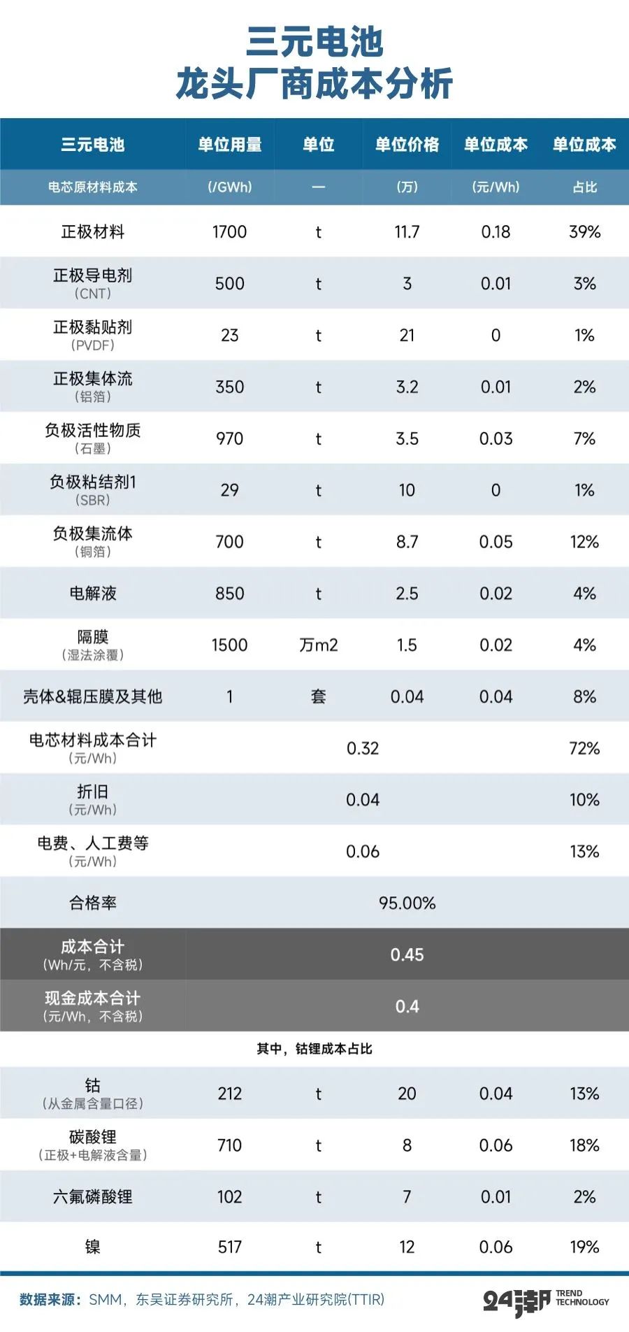 根據(jù)東吳證券此前分析測(cè)算,按照碳酸鋰8萬(wàn)價(jià)格測(cè)算,龍頭鐵鋰電芯成本預(yù)計(jì)0.32元/Wh左右(不含稅),龍頭三元523電芯成本預(yù)計(jì)0.45元/Wh左右(不含稅);而二線廠商鐵鋰與三元電芯成本約分別為0.37/Wh和0.50/Wh左右。