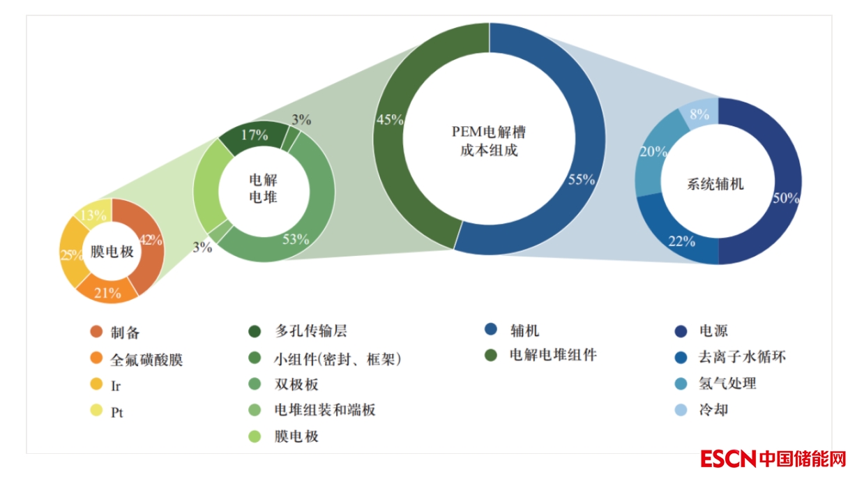 如圖7所示,對于PEM電解槽而言,電解電堆設(shè)備成本主要由雙極板等核心部件的成本驅(qū)動。在PEM電解槽電解電堆中雙極板成本占比約53%,主要因為其通常需要使用Au或Pt涂層。技術(shù)創(chuàng)新在雙極板的性能和耐久性增強以及成本降低方面發(fā)揮重要作用。目前正在研究價格更低廉的替代材料,如使用Ti涂層來保持其功能特性不受影響,同時降低成本。稀有金屬Ir是膜電極材料的重要組成部分,在實際應(yīng)用中,雖然Ir在整個PEM電解系統(tǒng)中成本占比不到10%,但由于供應(yīng)嚴(yán)重不足,可能成為后期PEM電解槽生產(chǎn)的瓶頸。PEM電解制氫系統(tǒng)輔機組成中的水循環(huán)和氫氣后處理也是降低成本的重要領(lǐng)域。