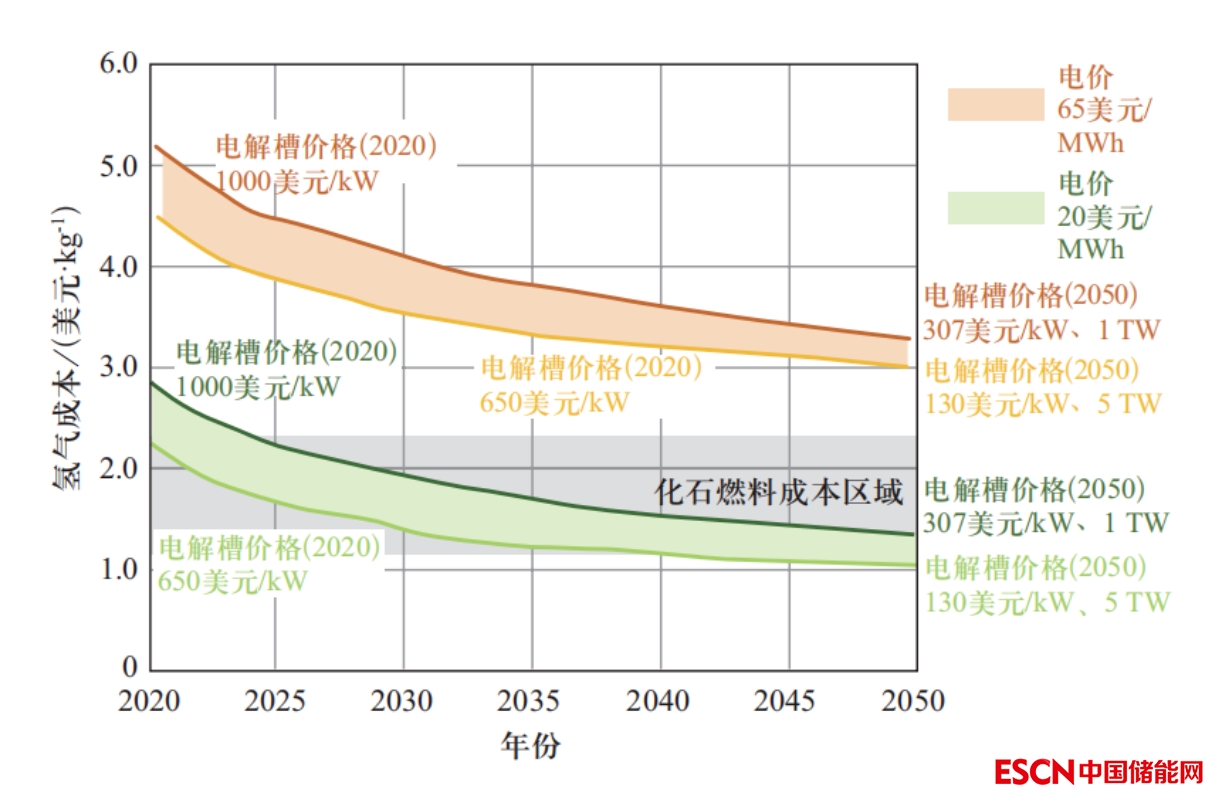 計算假設(shè):2020年產(chǎn)氫能耗51.2 kWh/kg,2050年產(chǎn)氫能耗43.8 kWh/ kg,折舊率8%,電解槽壽命80 000 h,2020年電解槽設(shè)備成本為650~1000美 元/kW,2050年成本為130~307美元/kW,且部署容量為1~5 TW。