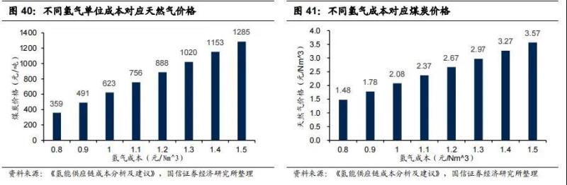 根據(jù)測算,在煤價及天然氣價格均屬正常區(qū)間(煤價:800 元/噸,天然氣:2.5 元/Nm3)時,天然氣制氫成本略高于煤制氫。由于天然氣占制氫總成本比例達 73%,煤炭占比約為 54%,天然氣制氫對于原料價格更為敏感。若考慮碳排放成本,假設(shè)征收 175 元/噸 CO2 情況下,單位天然氣制氫成本將增加 0.84 元/公斤,單位煤制氫成本則會增加 3.85 元。未來更多產(chǎn)業(yè)將被納入碳交易市場情況下,天然氣制氫成本將可能低于煤制氫。