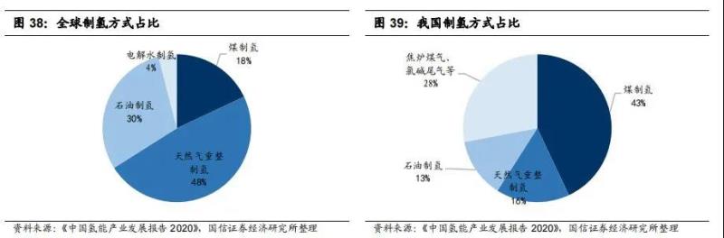 受限于我國“貧油少氣”的資源稟賦,盡管均以化石能源制氫為主要手段,但我國煤制氫占比高達 43%,天然氣及、石油制氫僅占 29%,而全球制氫方式中,煤制氫占比僅為 18%,天然氣占比達到 48%。電解水制氫方面我國 2020 年未產(chǎn)生大規(guī)模電解水制氫產(chǎn)量,產(chǎn)量微小,預(yù)計隨制取設(shè)備成本以及綠電價格下降,未來電解水制氫占比將不斷上升。