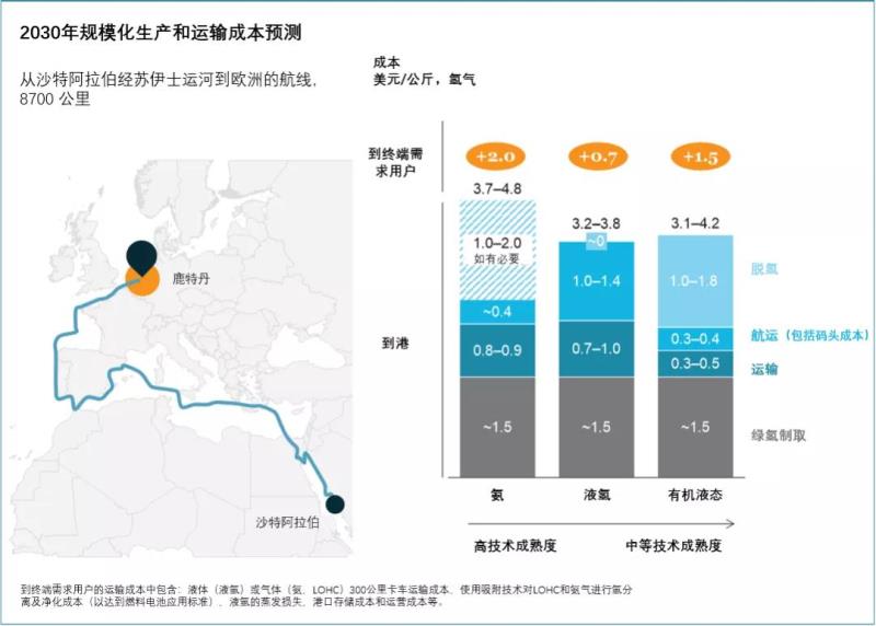 如果目的地需要液態(tài)或高純度氫氣,液氫儲運的效率最高。與氨和有機(jī)液態(tài)氫相比,液氫無需脫氫或裂解即可轉(zhuǎn)化為氫氣,不僅節(jié)省成本,且無需提純。液氫的主要缺點是體積能量密度相對較低,限制了船運的載氫量,同時儲運過程中會有蒸發(fā)損失。雖然液氫儲運是一種經(jīng)過驗證和商業(yè)化的技術(shù),但大規(guī)模液氫儲運仍處于試運營階段;氨擁有比液氫更高的體積能量密度,因此以氨的形式運輸比液氫儲運更具經(jīng)濟(jì)行。但氨后續(xù)裂解成氫的成本較高,且可分離的氫純度較低。此外,由于氨具有毒性,所以在特定區(qū)域會有儲運限制;液態(tài)有機(jī)儲氫可以應(yīng)用現(xiàn)有的柴油基礎(chǔ)設(shè)施,長期安全儲存氫,且不會發(fā)生損耗。但LOHC的主要缺點是脫氫過程需要大量的熱量,且與液氫和氨相比載氫能力有限。(圖6預(yù)測了2030年從沙特阿拉伯向西歐運輸綠氫的三種儲運成本構(gòu)成情況,包括制氫成本,到岸價格在3-5美元/公斤。)