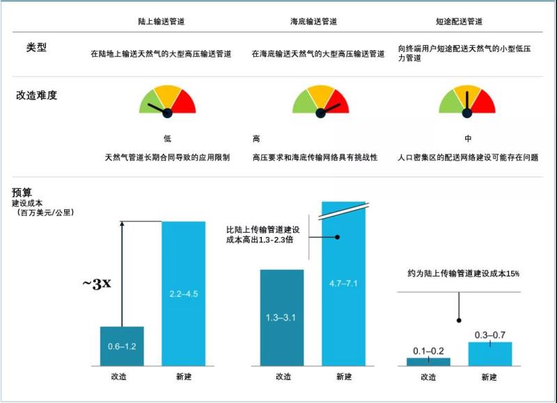根據(jù)目前的項目來看,陸上氫氣管道的改造成本約為60-120萬美元/公里,新建管道成本約為220-450萬美元/公里;對于海上/海底氫氣管道,根據(jù)新建或改造的具體條件和建設(shè)難度,成本要比陸上管道高出1.3到2.3倍;而短途配送管道由于其較小的管徑和較低的壓力要求,建設(shè)和改造成本比傳輸管道便宜得多(大約只占傳輸管道成本的15%),但只有未來住宅和商業(yè)建筑對氫氣的需求超過天然氣摻氫臨界值(20%)的情況下,短途配送管道的大規(guī)模建設(shè)才具有經(jīng)濟(jì)性。(見圖5)