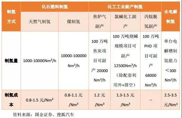 因此未來(lái)短時(shí)間內(nèi)我國(guó)氫能產(chǎn)業(yè)發(fā)展的氫源主要將來(lái)自化石燃料制氫(煤制氫)和化工工業(yè)副產(chǎn)氫(焦?fàn)t氣副產(chǎn)氫、氯堿副產(chǎn)、PDH即丙烷脫氫副產(chǎn)等)。下表為各種制氫方式的制氫規(guī)模以及成本。