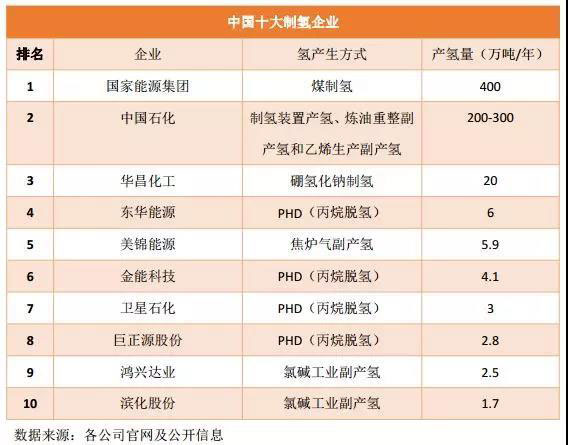 同時(shí),在化工工業(yè)副產(chǎn)氫方面,無(wú)論是焦?fàn)t氣副產(chǎn)氫氣、氯堿工業(yè)副產(chǎn)氫氣還是丙烷脫氫副產(chǎn)氫氣,涉及到的企業(yè)更是多達(dá)百家,因此本文中的中國(guó)十大制氫企業(yè),在設(shè)定標(biāo)準(zhǔn)時(shí),需同時(shí)滿(mǎn)足本身有穩(wěn)定的氫氣產(chǎn)能和已布局(或?qū)⒁季郑淙剂想姵禺a(chǎn)業(yè)兩個(gè)條件,排名順序根據(jù)企業(yè)的制氫量為標(biāo)準(zhǔn)。下表為中國(guó)十大制氫企業(yè)(按照制氫量進(jìn)行排名)。