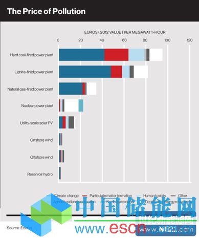 以上各發(fā)電形式的環(huán)境成本為近似值,但是顯示了各發(fā)電技術(shù)產(chǎn)生的環(huán)境危害程度。