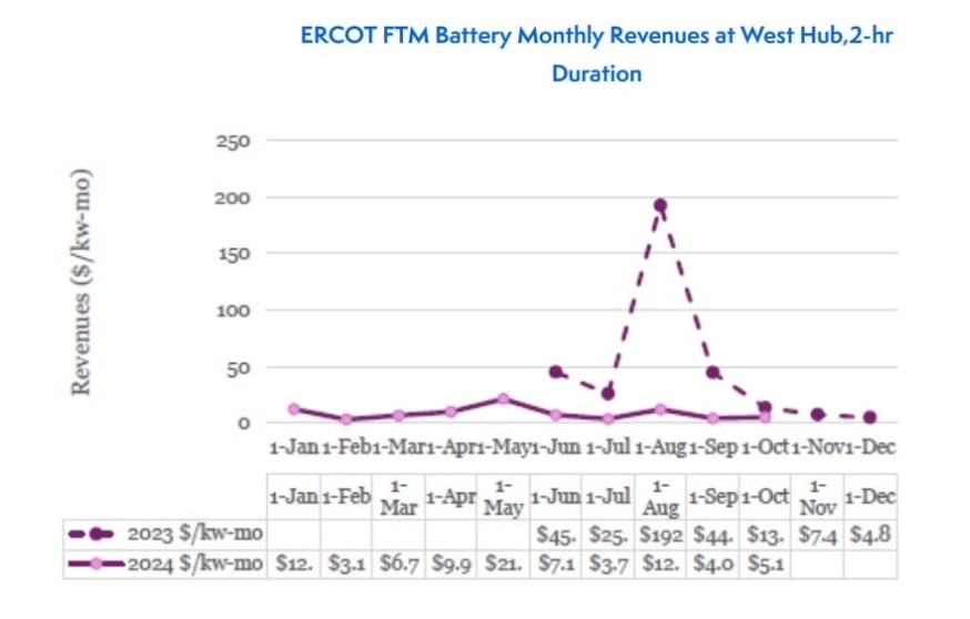 研究發(fā)現(xiàn),在2024年電力需求較高的月份,ERCOT市場運(yùn)營的電池儲能系統(tǒng)收入大幅下降,僅為2023年的5%~10%。響應(yīng)性儲備服務(wù)(RRS)價格從2023年的120美元/MWh暴跌至2024年的8美元/MWh,降幅高達(dá)15倍。