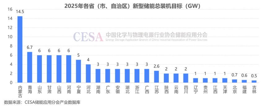 據(jù)CESA儲(chǔ)能應(yīng)用分會(huì)產(chǎn)業(yè)數(shù)據(jù)庫不完全統(tǒng)計(jì)的全國25個(gè)?。ㄊ小⒆灾螀^(qū))2025年的新型儲(chǔ)能裝機(jī)目標(biāo)中山東、甘肅、山西、河南總裝機(jī)目標(biāo)均為6GW,并列全國第三。