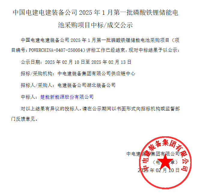 中國儲(chǔ)能網(wǎng)訊:2月10日,中國電建電建裝備公司2025年1月第一批磷酸鐵鋰儲(chǔ)能電池采購項(xiàng)目中標(biāo)結(jié)果公布,楚能新能源成為唯一中標(biāo)人。據(jù)悉,該項(xiàng)目為總?cè)萘?00MWh的314Ah磷酸鐵鋰儲(chǔ)能電池采購。