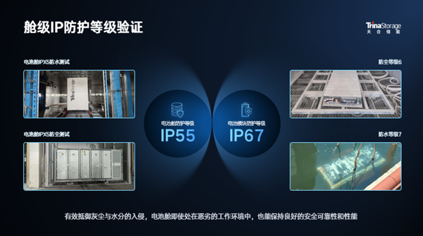 基于電芯安全,天合儲能從原料入手,開發(fā)了極致安全的活性材料,隔膜以及電解液,保障產(chǎn)品本征安全性。基于系統(tǒng)級安全,天合儲能采用防水、防火、防腐等高防護材料和高強度硬件設(shè)計,通過IP55/C5防護等級測試,使產(chǎn)品無懼各種惡劣環(huán)境。