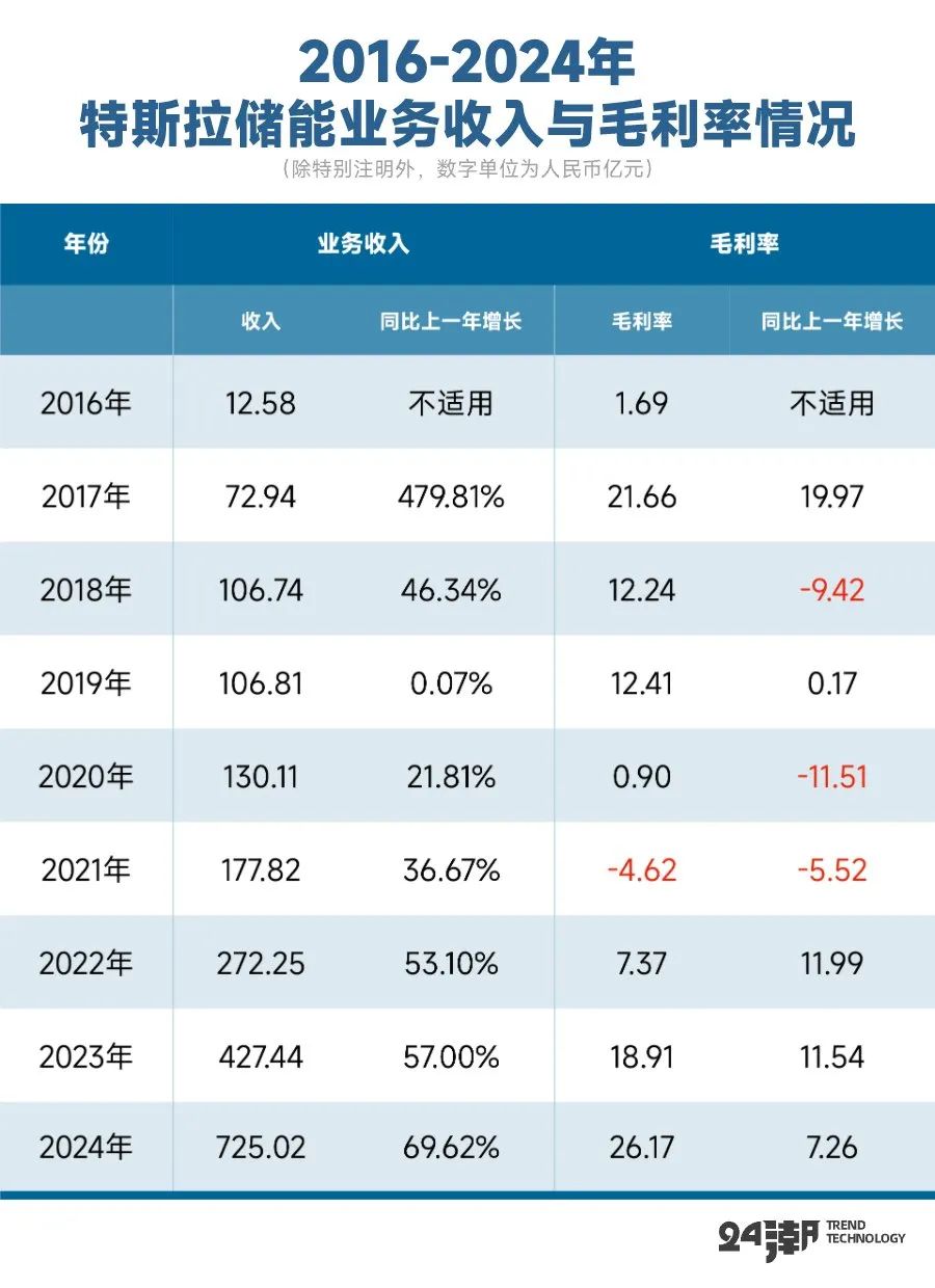 另據24潮產研究院(TTIR)統(tǒng)計,在2016-2024年期間特斯拉儲能業(yè)務收入一直保持增長趨勢(從未出現(xiàn)下降),年收入從12.58億元(人民幣,下同)增長至725.02億元,9年間年收入增長了56.63倍;儲能收入占整體營業(yè)收入比例也從2.59%增長至10.32%;9年間儲能業(yè)務收入合計達2031.71億元。