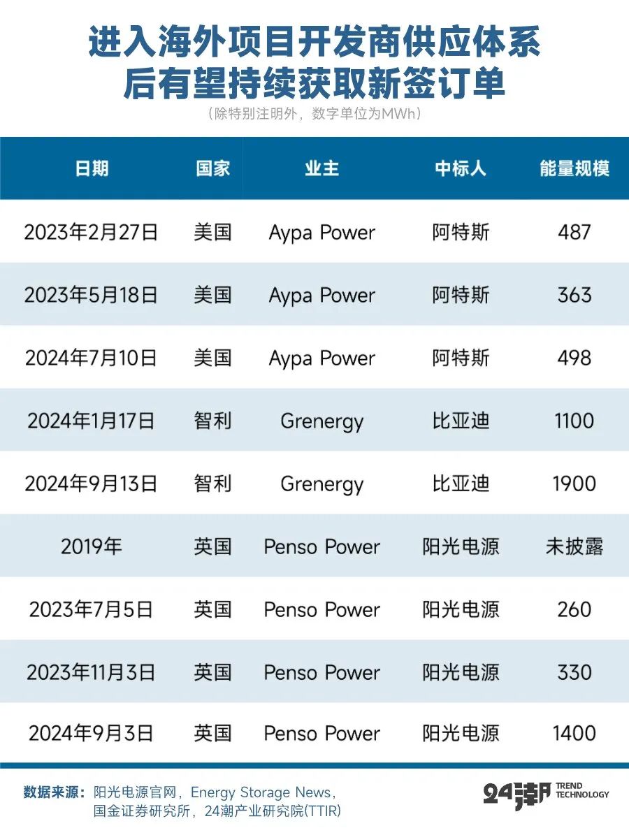 其一,海外電力市場化程度普遍較高,不同國家和地區(qū)有不同的技術標準和法規(guī)要求,對系統(tǒng)集成商的經驗和技術要求更高,因此具有海外成熟項目業(yè)績積累的集成商更易獲取客戶信任。同時,由于海外大型新能源開發(fā)商儲備項目規(guī)模較大,進入客戶供應體系并成功交付項目后有望持續(xù)獲取新簽訂單,以國內陽光電源、阿特斯、比亞迪近幾年新簽訂單為例,其中不乏與同一個開發(fā)商簽約多個項目的案例。
