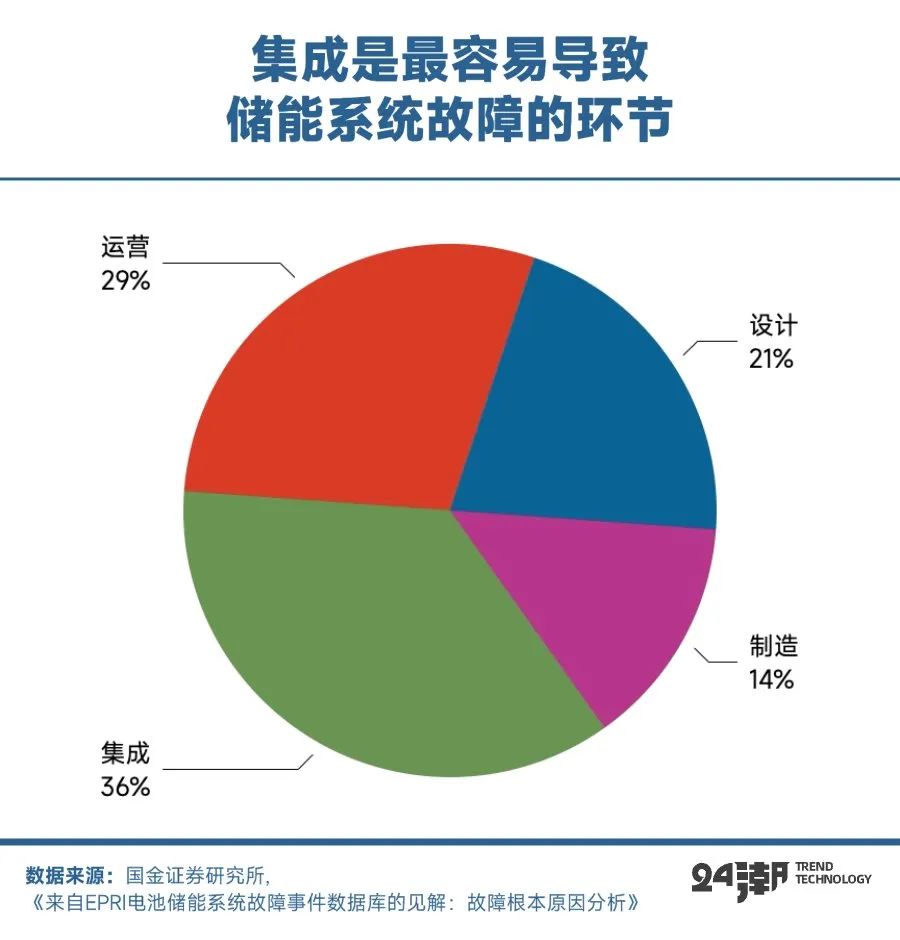 與普遍認知不同,從故障分析結果來看,集成、組裝及施工階段的難度大于制造。根據美國電力研究所(EPRI)發(fā)布的《來自EPRI電池儲能系統(tǒng)故障事件數據庫的見解:故障根本原因分析》報告,與以往普遍認為電池是造成系統(tǒng)故障的觀點不同,報告根據對過往26個儲能項目的故障分析,認為BOS和控制系統(tǒng)是故障最常見的原因,電池單元本身的故障相對較少;同時故障更多出現(xiàn)在集成、組裝和施工環(huán)節(jié),其次是運營環(huán)節(jié),而制造問題導致的故障數量最少,體現(xiàn)出集成商交流側集成能力和現(xiàn)場調試經驗等 “軟實力” 的重要性。