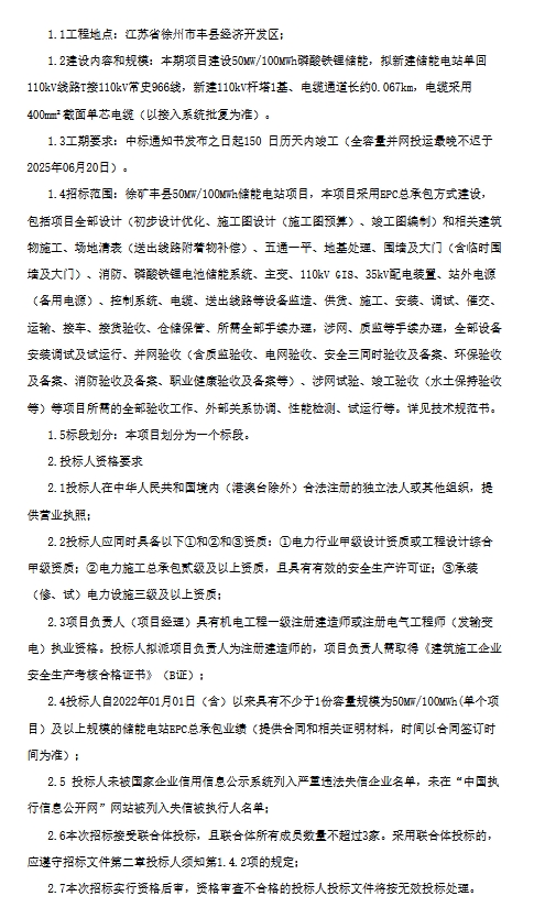 要求投標(biāo)人自2022年01月01日(含)以來具有不少于1份容量規(guī)模為50MW/100MWh(單個(gè)項(xiàng)目)及以上規(guī)模的儲(chǔ)能電站EPC總承包業(yè)績。