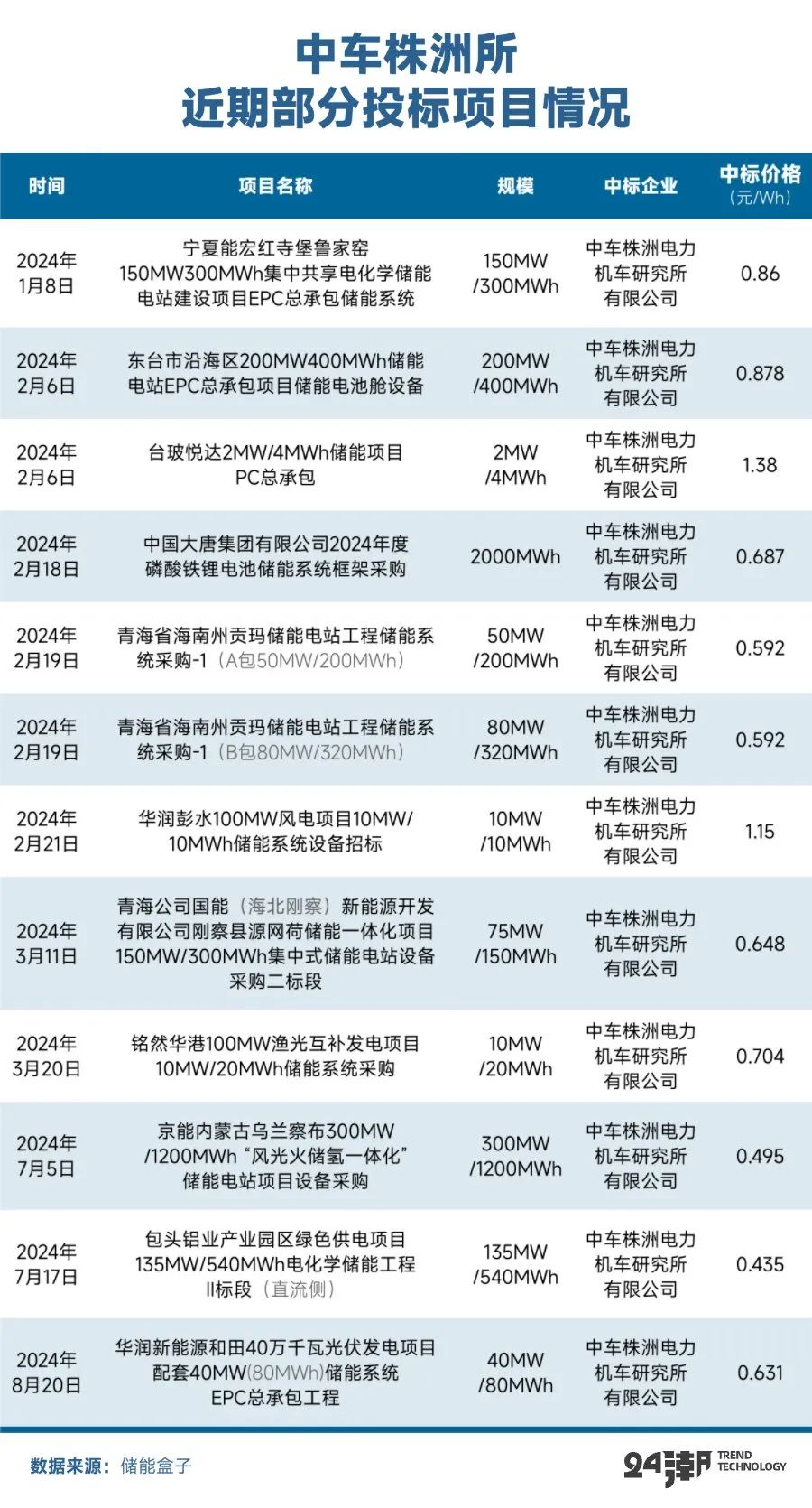 2023年,廣東省能源集團新疆有限公司225MW/900MWh儲能系統(tǒng)采購中,中車株洲所以0.638元/Wh的低價讓外界刮目;2024年2月,青海兩大儲能電站的招標中,其以0.592元/Wh的報價在27家競爭者中位列倒數(shù)第二,令人矚目。