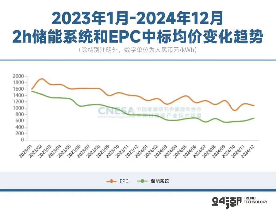 中標價格方面,2024年儲能系統(tǒng)中標均價到12月份(2h磷酸鐵鋰)已下滑至0.697元/Wh,與年初相比下降11%。而電芯價格到年底最低也有0.3元/Wh,這已經(jīng)逼近供應商的極限。