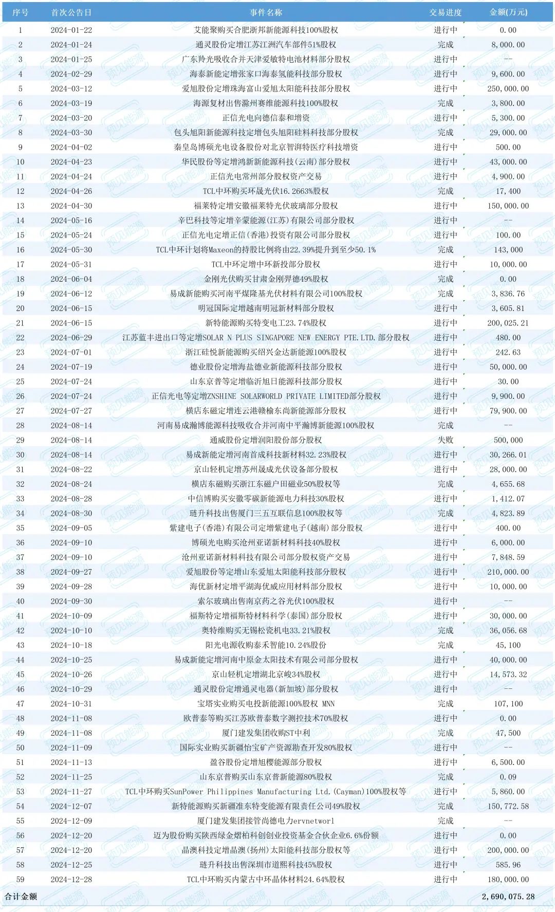預(yù)見能源就此根據(jù)公開資料,不完全統(tǒng)計(jì)了2024年一整年光伏行業(yè)發(fā)生的并購事件。據(jù)統(tǒng)計(jì),這一年光伏行業(yè)發(fā)生的并購事件有59起,其中正在進(jìn)行41起,已完成17起,失敗1起,據(jù)預(yù)見能源不完全統(tǒng)計(jì),上述并購事件涉及的金額高達(dá)269億元。