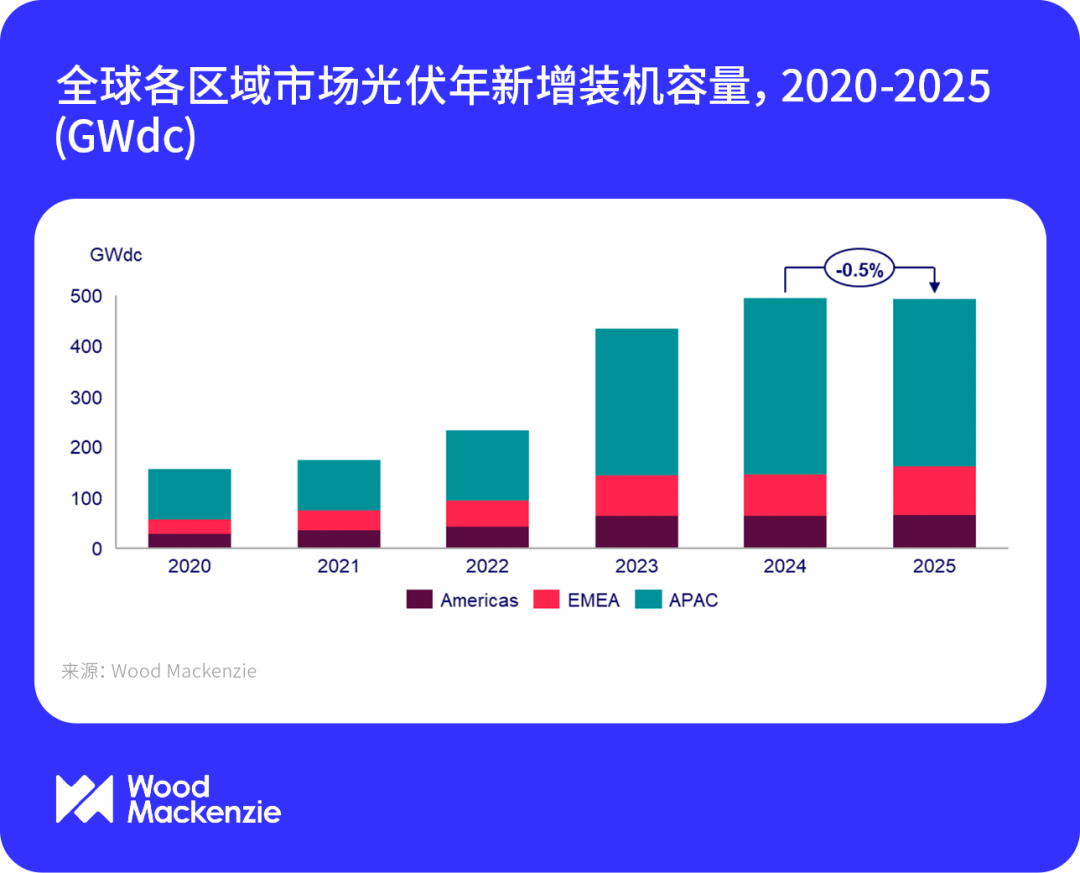 中國儲能網(wǎng)訊:2024年全球光伏市場延續(xù)增長態(tài)勢,新增裝機(jī)容量達(dá)到495GWdc,同比增長14%。由于數(shù)據(jù)中心的激增和電氣化趨勢的增強(qiáng),全球各地區(qū)的電力需求都將上升。然而,受制于政策的不確定性、區(qū)域保護(hù)主義的抬頭以及并網(wǎng)瓶頸等因素,即便在當(dāng)前組件供應(yīng)過剩的情況下,也會使全球光伏市場年度增長趨勢受挫。這些限制因素以及各區(qū)域市場的動態(tài)變化,將導(dǎo)致2025年全球光伏新增裝機(jī)容量降至493GWdc,同比略有縮減。