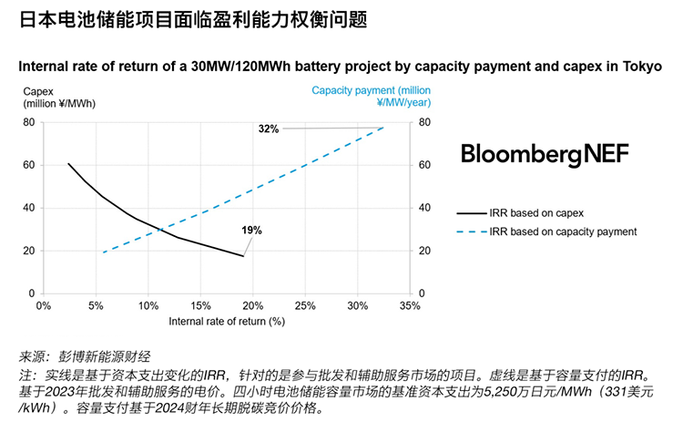 東京地區(qū)一個30MW/120MWh項目的內(nèi)部收益率(假設(shè)以競價價格上限參與日本容量競價)