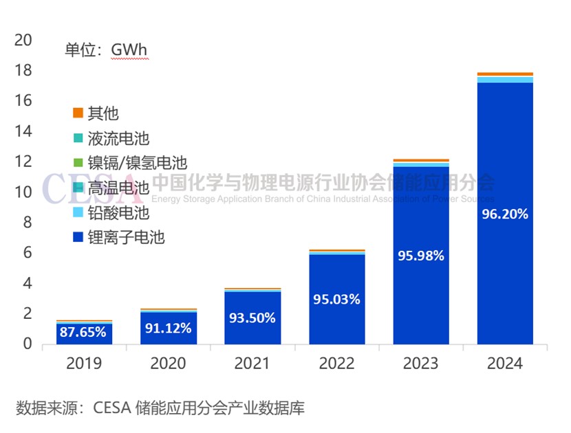 截至到2024年底,德國(guó)電池儲(chǔ)能累計(jì)裝機(jī)項(xiàng)目中,鋰離子電池儲(chǔ)能累計(jì)裝機(jī)17.2GWh,容量占比96.2%。德國(guó)鋰離子電池儲(chǔ)能在電池儲(chǔ)能累計(jì)裝機(jī)中的占比從2020年初的87.65%,一路攀升至如今的96.2%。