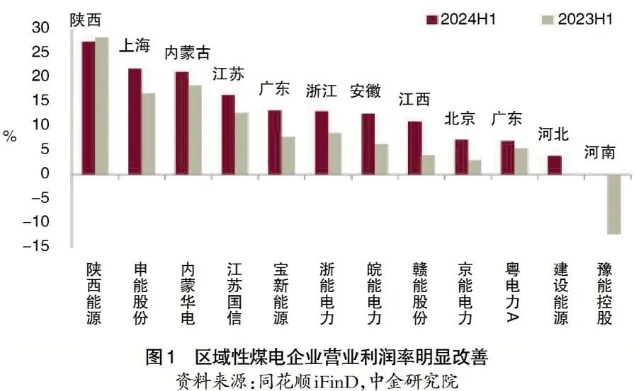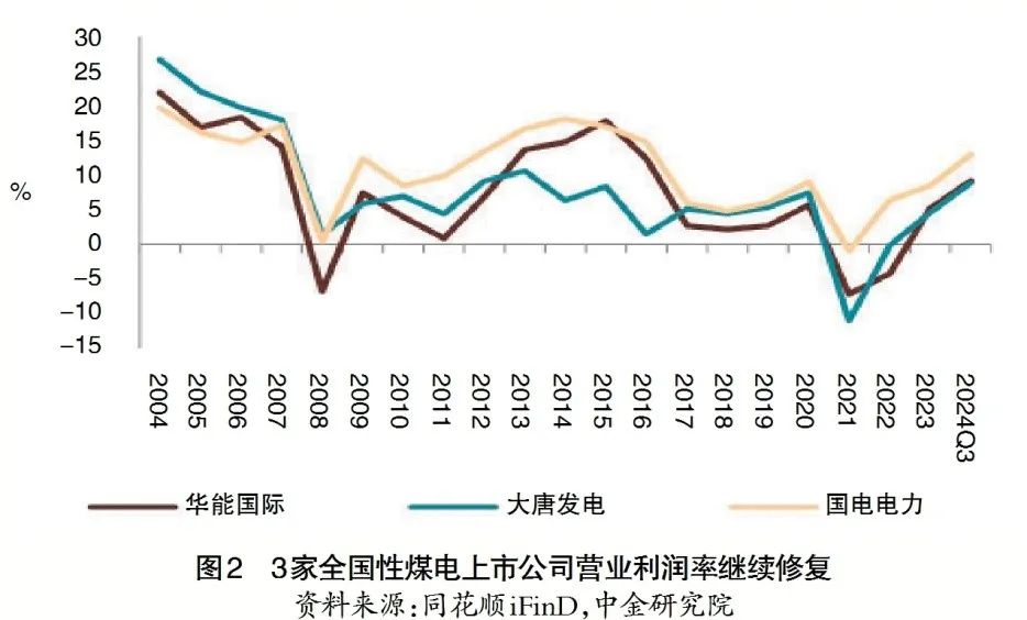 煤電容量電價政策自2024年1月1日起實施,旨在回收部分固定成本、穩(wěn)定煤電行業(yè)預(yù)期,保障煤電更好發(fā)揮支撐調(diào)節(jié)價值。在過去幾年部分煤電機組虧損的背景下,容量電價也有望幫助其扭虧為盈,特別是有助于推動煤-電矛盾突出、煤電轉(zhuǎn)型較快地區(qū)、運行時間較短的煤電機組扭虧為盈(見圖1),起到“雪中送炭”的作用。從實際經(jīng)營數(shù)據(jù)看,2024年,煤電企業(yè)的營業(yè)利潤率普遍有所修復(fù),例如華能國際、大唐發(fā)電、國電電力這3家全國性煤電上市公司的營業(yè)利潤率在2024年前三季度在10%左右(見圖2),落入了中金研究院在2024年初發(fā)布的《新型電力系統(tǒng)電價機制:保障煤電發(fā)揮支撐調(diào)節(jié)價值》中提出的合理利潤率區(qū)間。