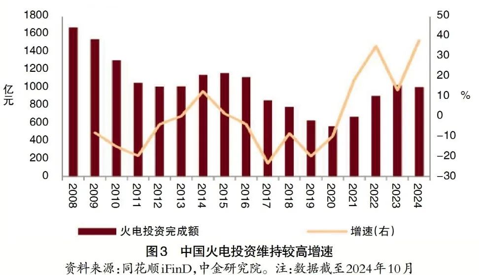 煤電企業(yè)利潤率的修復(fù)有利于支撐近年來持續(xù)高位的煤電投資(見圖3)。2021年來,部分地區(qū)出現(xiàn)電力供應(yīng)緊張甚至限電現(xiàn)象,煤電對于電力保供的價值再次凸顯,隨之而來的是煤電裝機核準量和相關(guān)投資快速增長。但2021~2023年煤電企業(yè)在高煤價的壓制下依然存在較大的經(jīng)營壓力,難以支撐快速增長的新增投資,我們可以用度電投資與度電利潤之比衡量企業(yè)利潤中用于投資的比例,這一指標越高說明利潤支撐投資的壓力越大(見圖4)。我們測算發(fā)現(xiàn),近年來度電投資與度電利潤之比大幅偏離過去的平均水平(為40%左右),其中2021和2022年我們估算全國煤電企業(yè)平均度電利潤為負值,2023年度電利潤雖然轉(zhuǎn)正,但度電投資與度電利潤之比接近100%,這意味著企業(yè)當年幾乎沒有剩余利潤用于償還債務(wù)、股東分紅,或留存以應(yīng)對未來不確定性或投資機會。2024年,我們測算煤電企業(yè)的度電投資與度電利潤之比逐步回歸正常,有利于煤電高質(zhì)量健康發(fā)展。