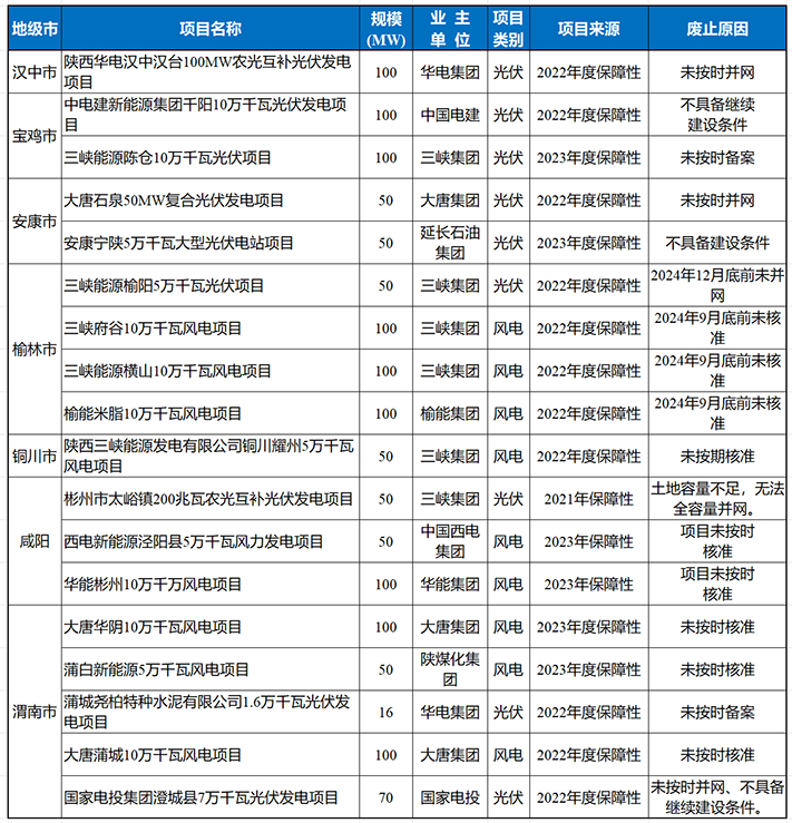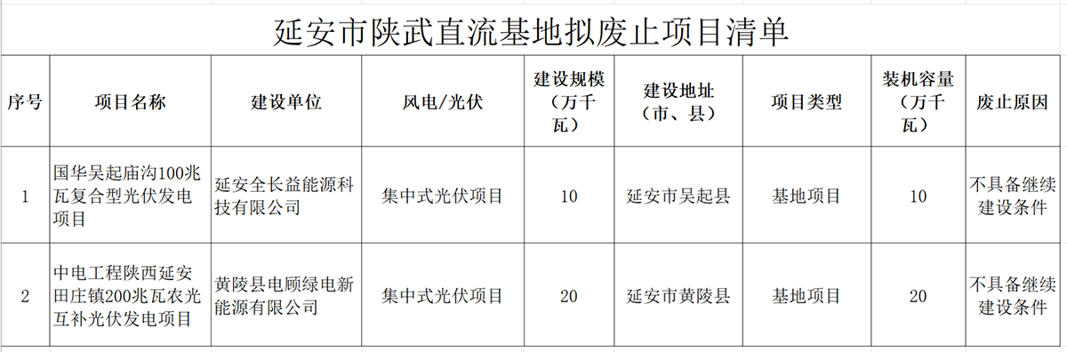 根據(jù)省發(fā)改委《關(guān)于梳理陜西省2021—2023年度保障性項目及基地項目廢止清單的通知》(陜發(fā)改能新能源﹝2025﹞36號)要求,經(jīng)梳理,擬對國華吳起廟溝100兆瓦復(fù)合型光伏發(fā)電項目、中電工程陜西延安田莊鎮(zhèn)200兆瓦農(nóng)光互補光伏發(fā)電項目進行廢止,現(xiàn)予以公示,如有異議,請在公示期內(nèi)以書面形式實名反映。公示時間:2025年2月25日至2025年3月3日聯(lián)系電話:0911-7090220,地址:延安市新區(qū)為民服務(wù)中心綜合樓220室。