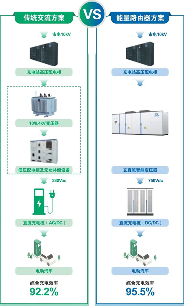 我們知道,一般常規(guī)充電場站采用的都是交流變壓器,將10千伏高壓交流電降壓至380伏交流電,再通過充電樁內置轉換器將交流電轉為直流電為新能源汽車充電,這種“高壓交流→低壓交流→直流”的二級轉換過程中,每次電能轉換會產生3%-5%的能量損耗。