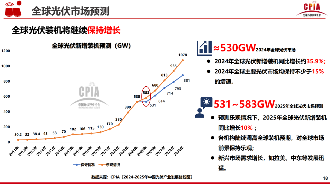 王勃華預(yù)測,2025年,全球光伏新增裝機(jī)531~583GW,樂觀情況下同比增長10%,我國新增裝機(jī)215~255GW。拉美、中東等新興市場發(fā)展迅猛,或?qū)硇碌臋C(jī)遇。