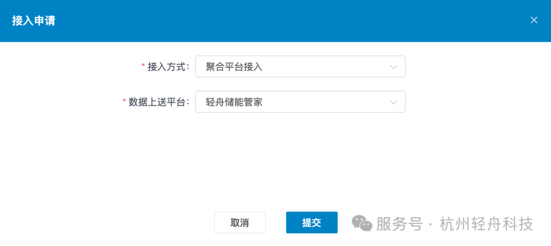 2. 接入申請(qǐng)選擇:聚合平臺(tái)接入-輕舟儲(chǔ)能管家,如下圖,選擇后直接提交即可。