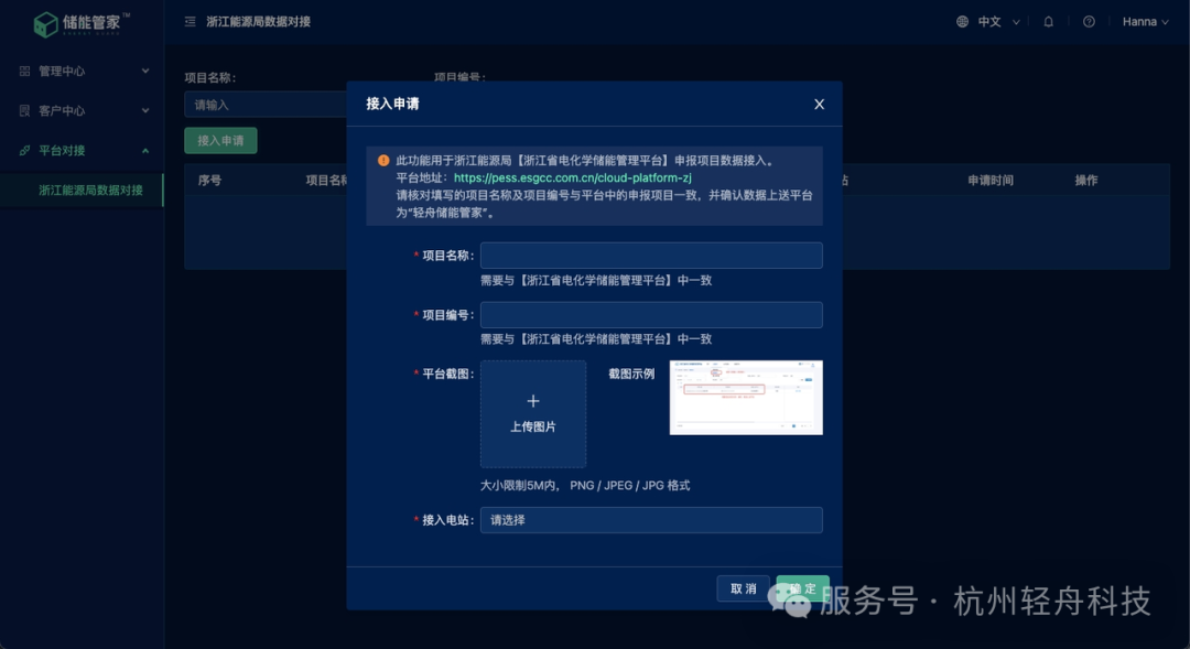 3. 進(jìn)入輕舟儲(chǔ)能管家-后臺(tái)-平臺(tái)對(duì)接-浙江能源局對(duì)接,點(diǎn)擊接入申請(qǐng),請(qǐng)按照內(nèi)容規(guī)范填寫,確認(rèn)無(wú)誤后點(diǎn)擊確定,數(shù)據(jù)即可推送至浙江省化學(xué)儲(chǔ)能管理平臺(tái)。