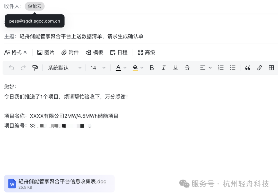 郵件標(biāo)題:輕舟儲(chǔ)能管家聚合平臺(tái)上送數(shù)據(jù)清單,請(qǐng)求生成確認(rèn)單